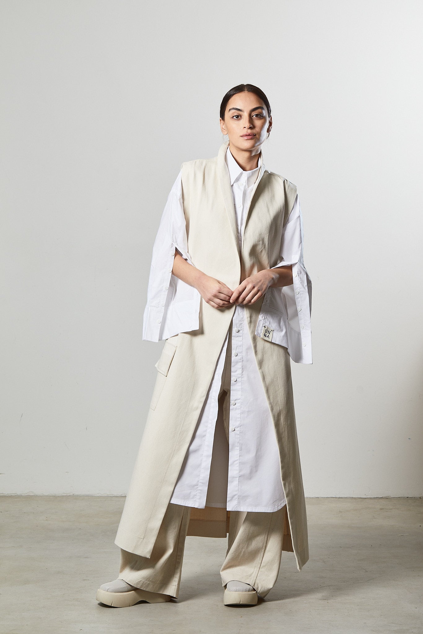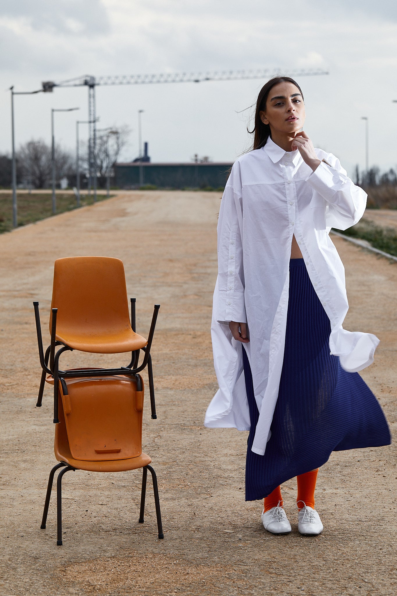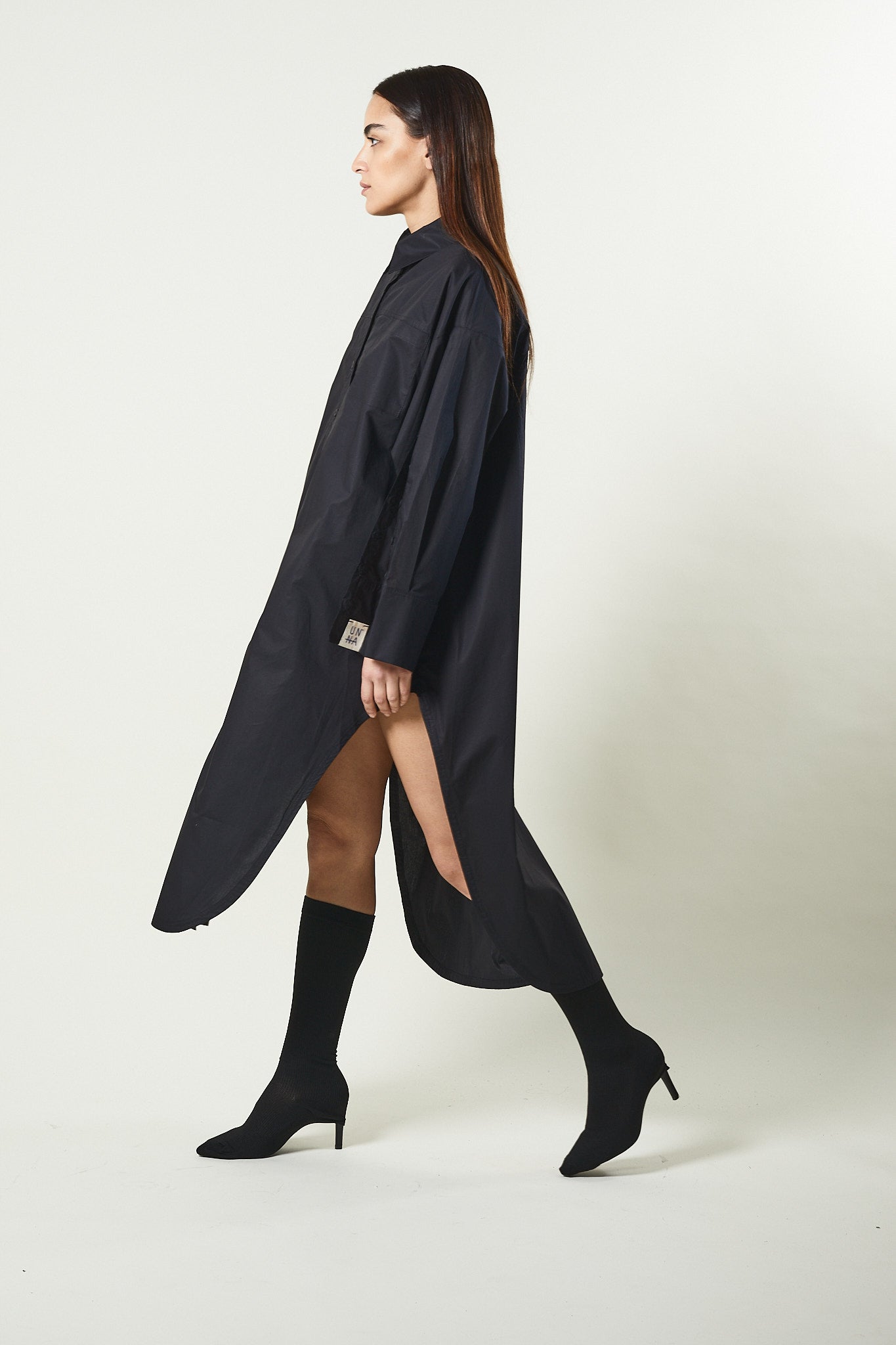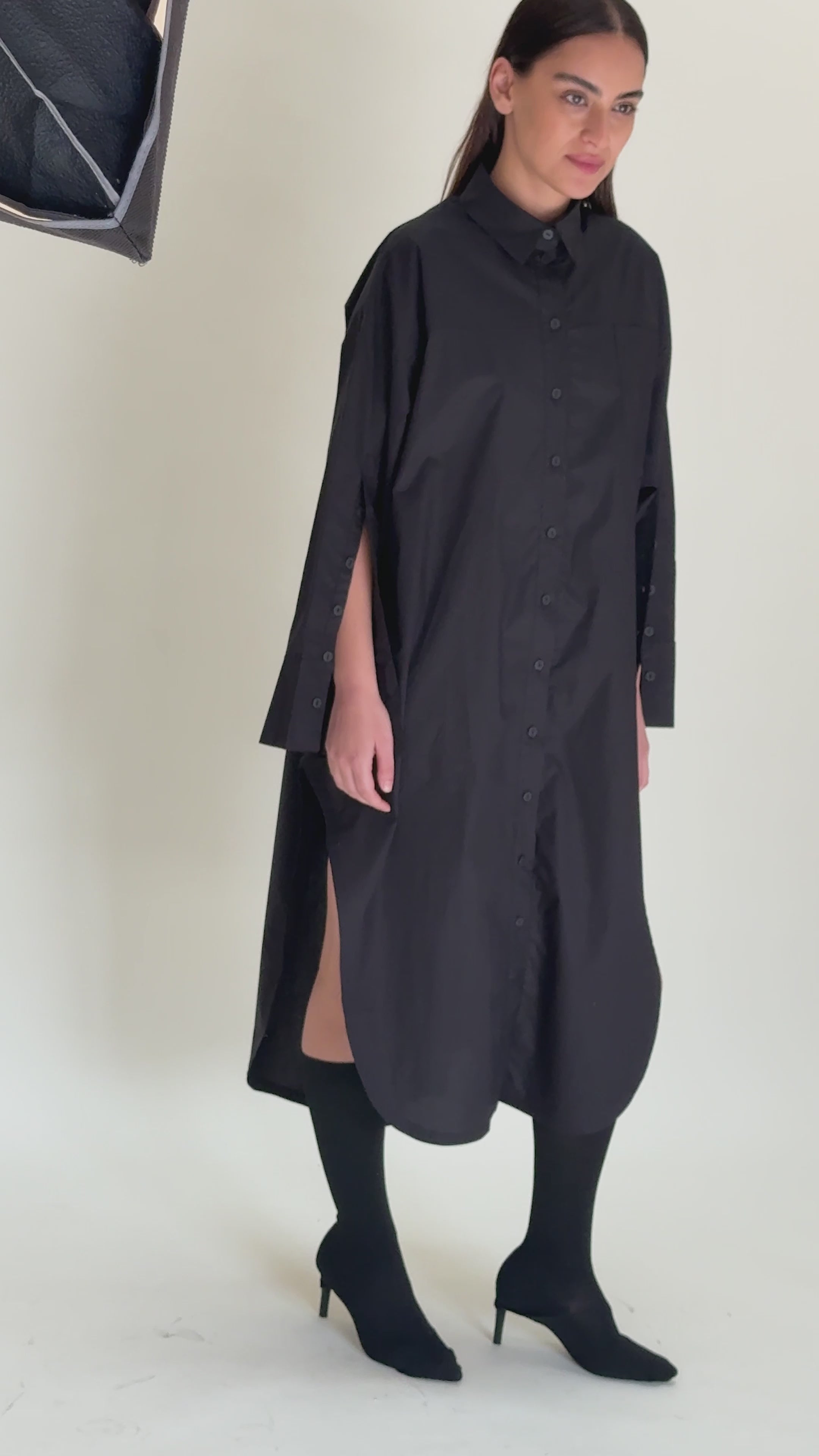 100% cotton shirt, one size, oversize and midi length. Long sleeves with buttons down to mid-arm so it can be rolled up. Embroidery on the back and side slits.