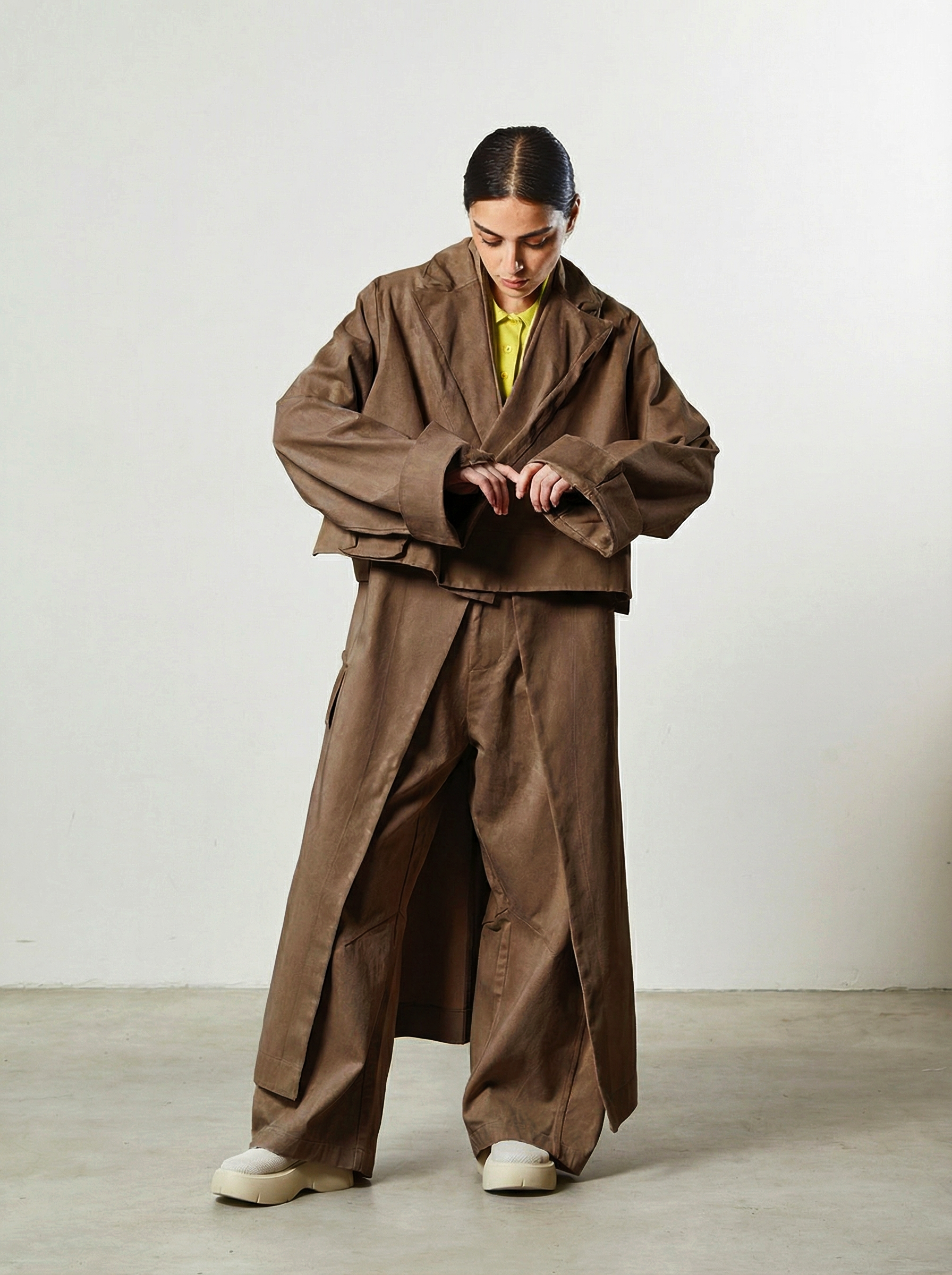 Trench de sarga de algodón 100% desmontable en dos piezas que se pueden usar por separado: chaleco largo y cazadora.
